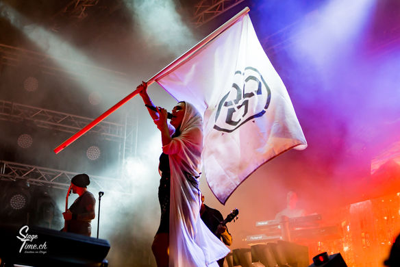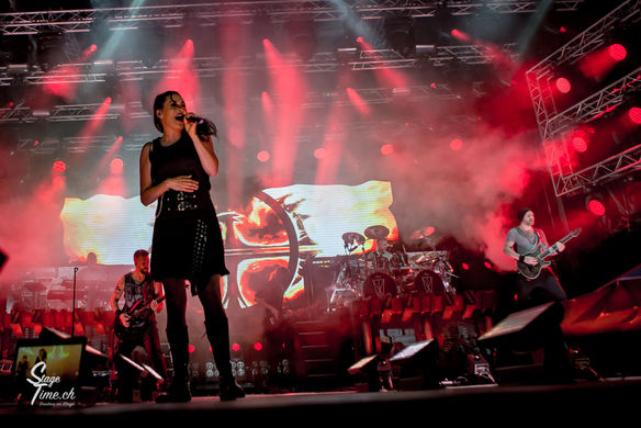 Ganz anders der Auftritt von Within Temptation mit Frontfrau Sharon den Adel. Die aus dem Gothic (bis 1996) kommende holländische Band überzeugte mit einem theatralischen Beginn. Sharon kam im weissen Mantel mit Kapuze und einer Flagge auf der Schulter tragend, langsam schreitend auf die Bühne und eröffnete mit «Raise Your Banner» vom aktuellen Album «Resist».